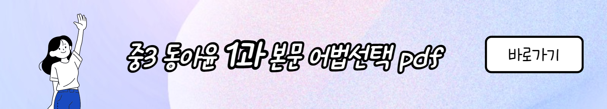 | 중3 영어 동아윤 1과 Find a dream and Live it 어법선택 정답 pdf (0) | 2023.03.30 |