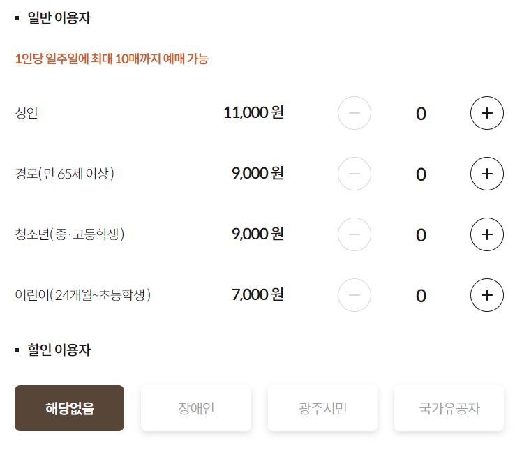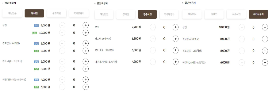아래쪽에 장애인, 광주시민, 국가유공자 여부에 따라 할인도 적용되니,